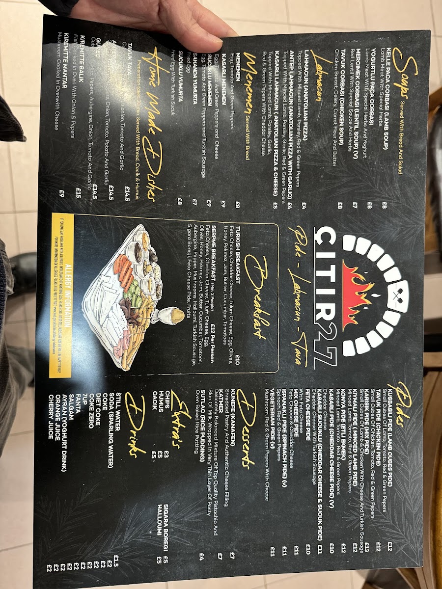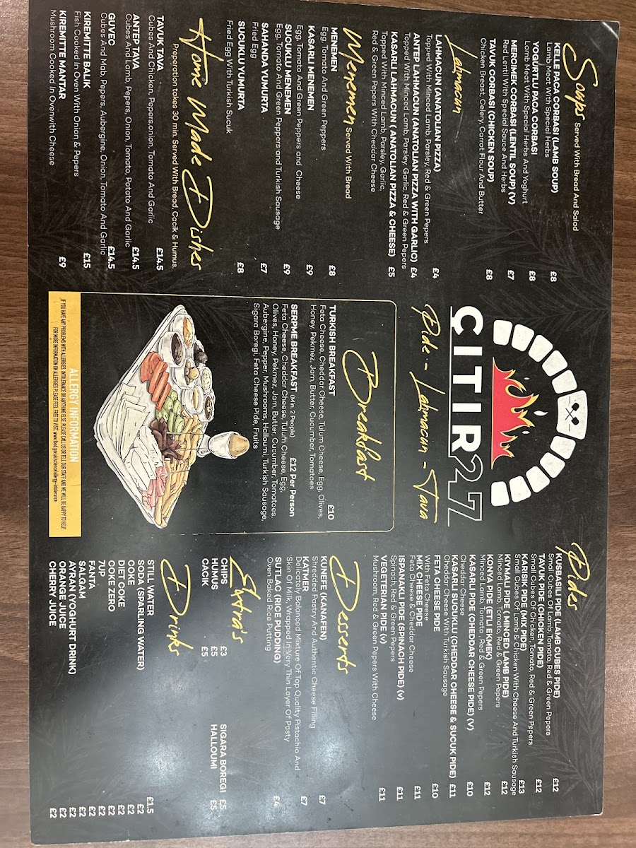 Feta Cheese, Cheddar Cheese, Tulum Cheese, Egg, Olives, Honey, Pekmez, Jam, Butter, Cucumber, Tomatoes, Aubergine, Pepper, Mushrooms, Halloumi, Turkish Sausage, Sigara Boregi, Feta Cheese Pide, Fruits